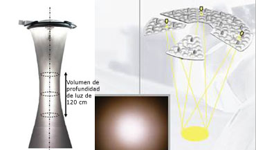 Diseño innovador que, gracias a su gran volumen de luz, no requiere volver a enfocar la lámpara durante la intervención. Los lentes de Fresnel producen múltiples haces luminosos que generan un volumen de luz homogéneo para disponer de una visión ideal tanto en superficie como en profundidad.