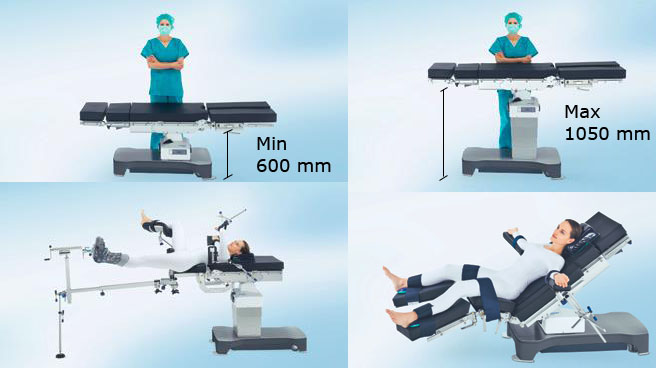 Sus rangos extensos de ajuste brindan máxima flexibilidad en el posicionamiento del paciente para todos los procedimientos: 25° Trendelenburg; 35° Trendelenburg inverso; 20° inclinación lateral; de 600 a 1050 mm de altura.